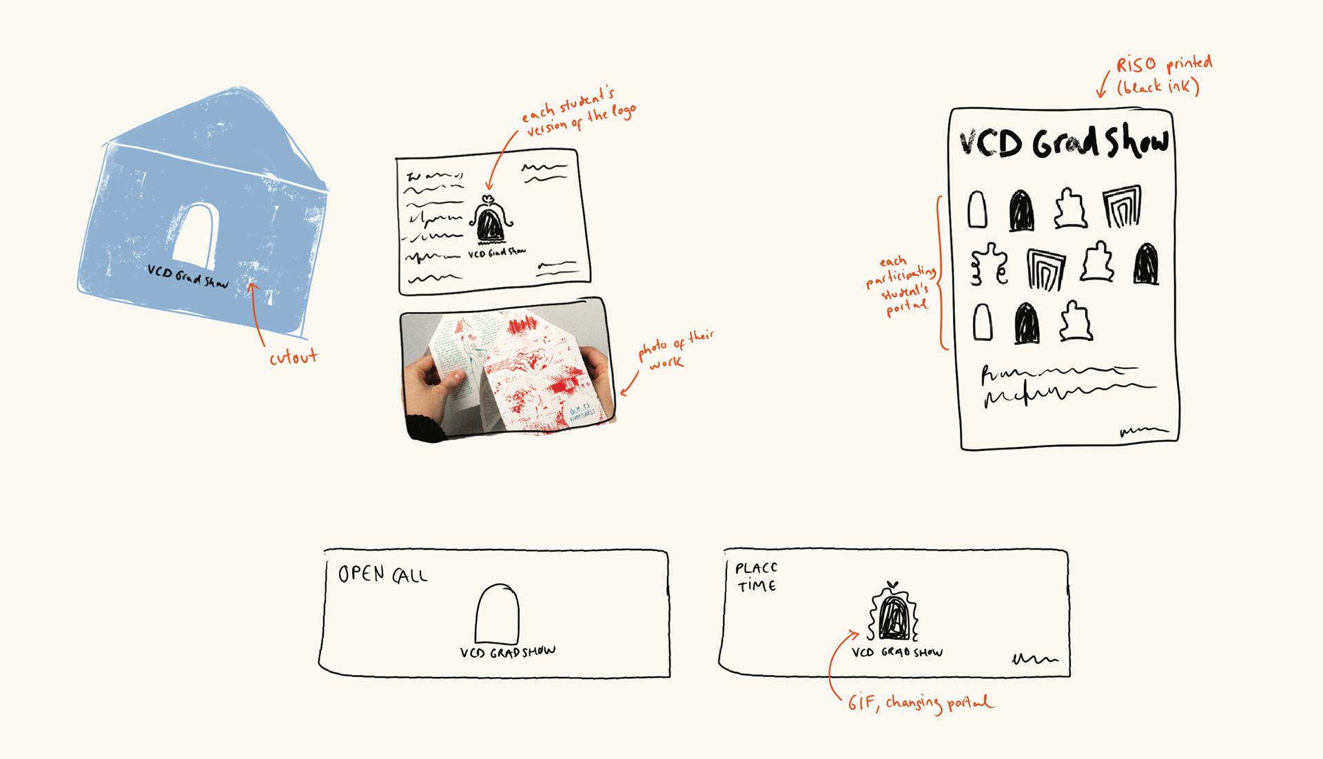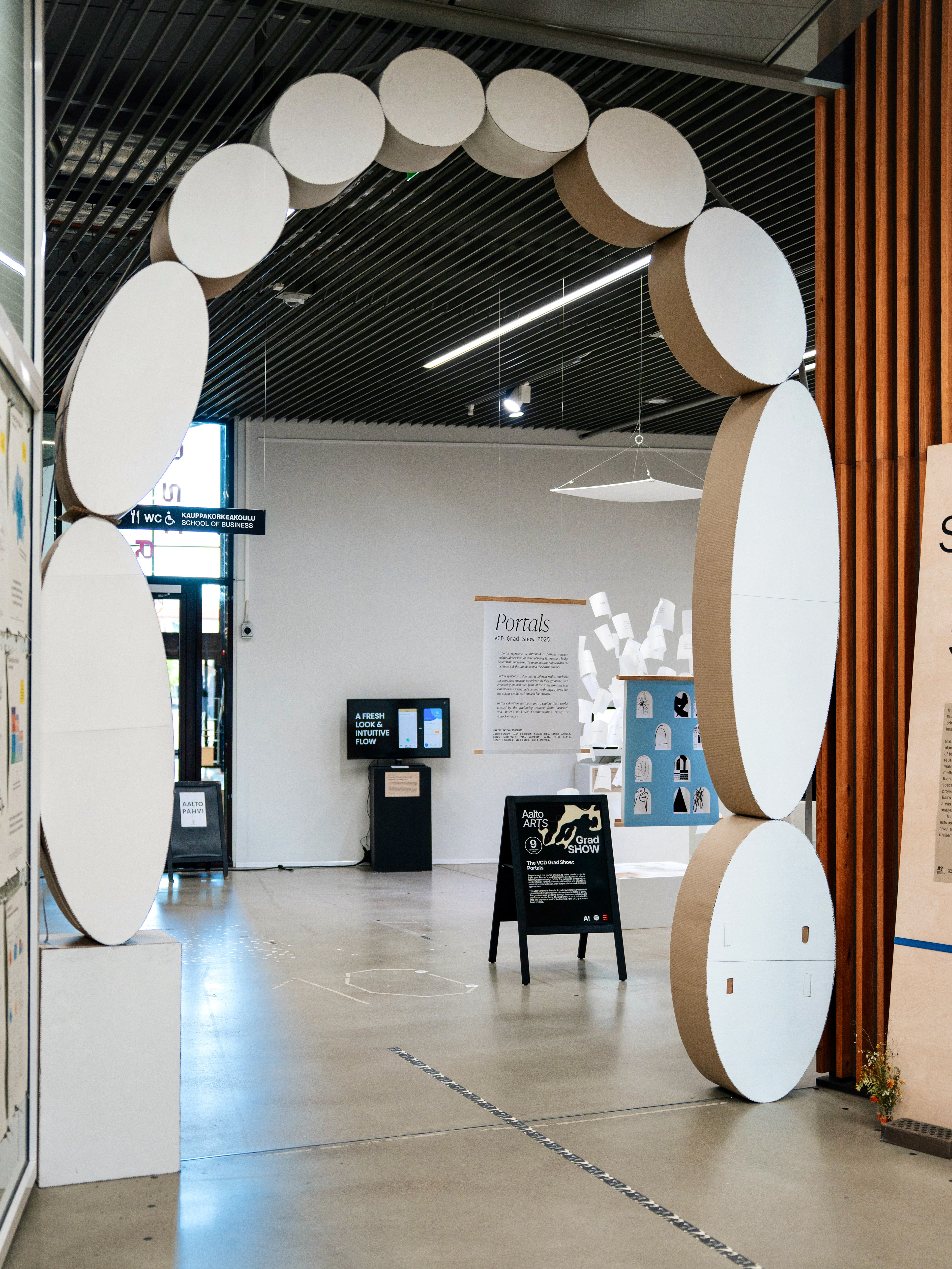 The idea of an “overarching concept” led me to think about arches, and from arches to portals. This felt like a natural fit: each student’s work becomes a portal into their own creative world, and the grad show would be the platform that invites visitors to step into these portals.