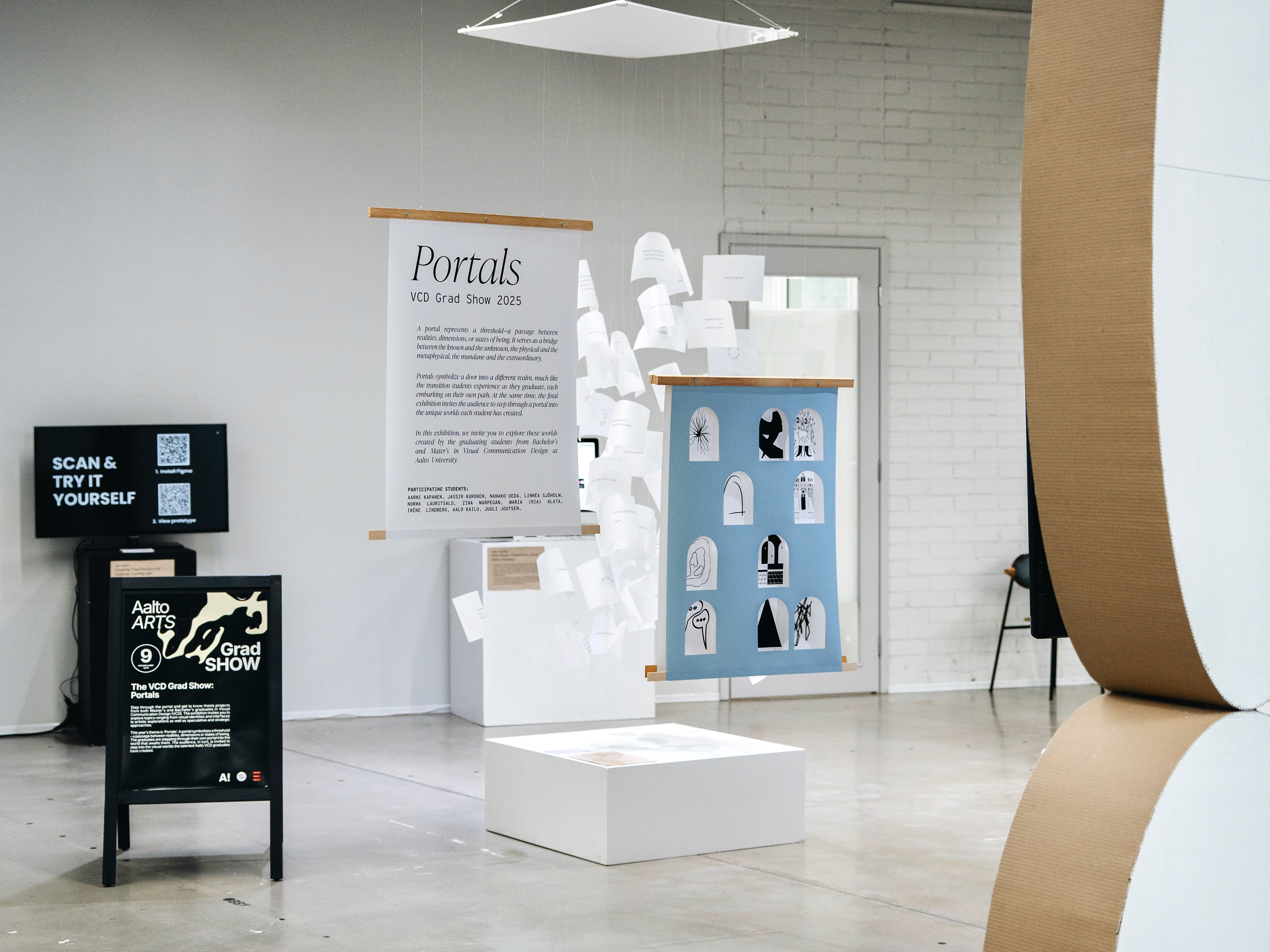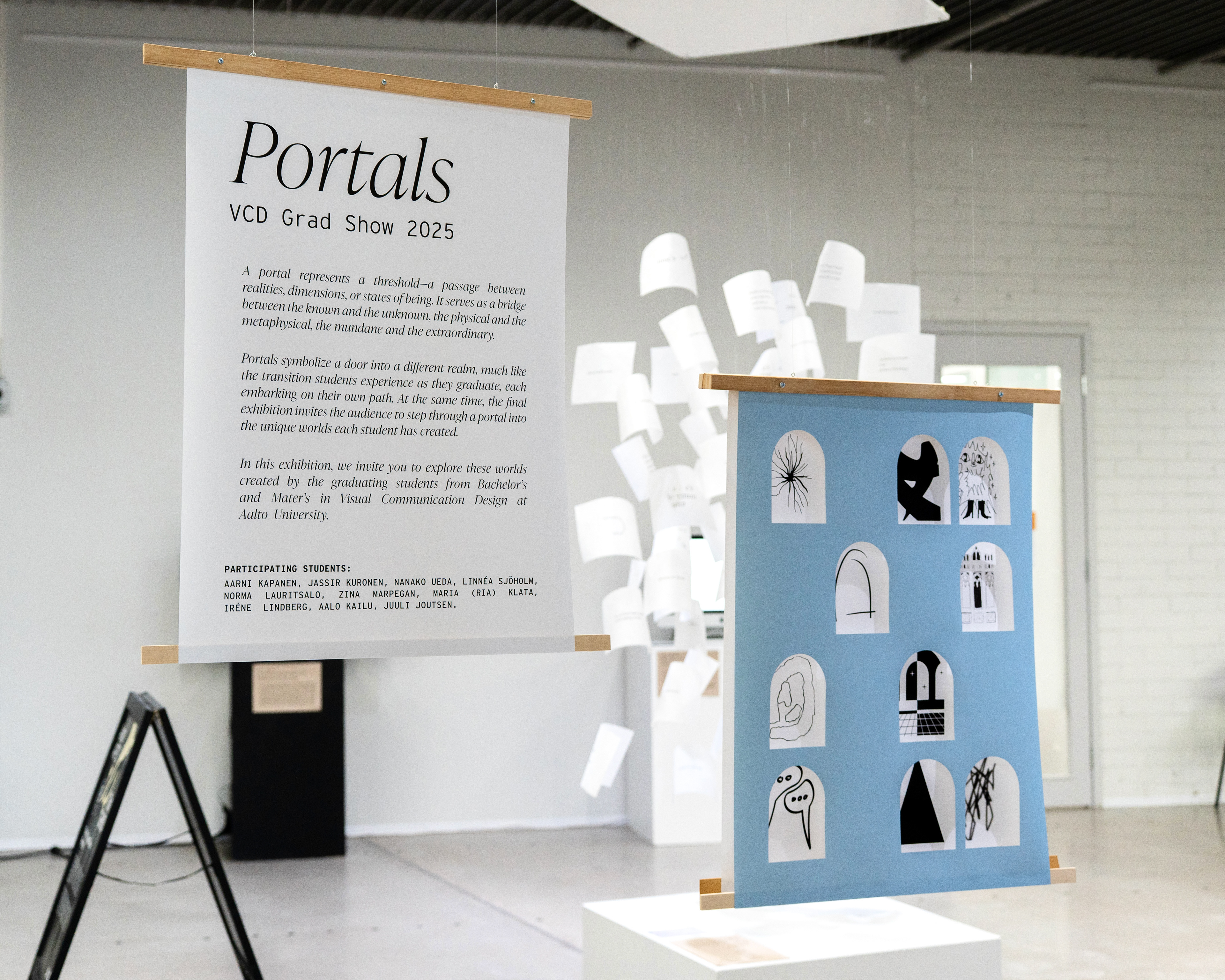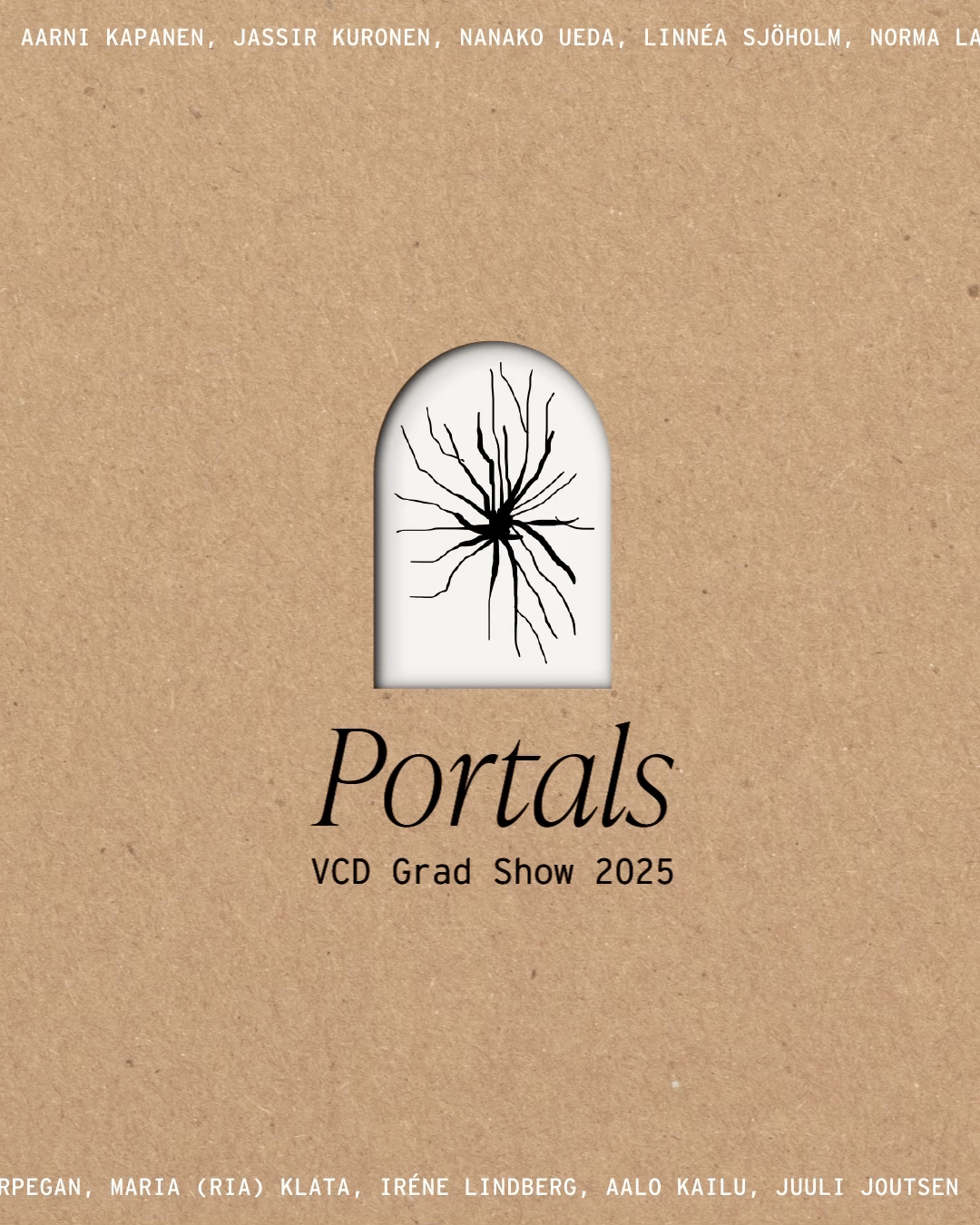 The guiding idea behind Portals was to create a framework rather than a focal point. As a graduation show, the spotlight should remain on the students’ work, with the visual identity acting as a supportive structure.