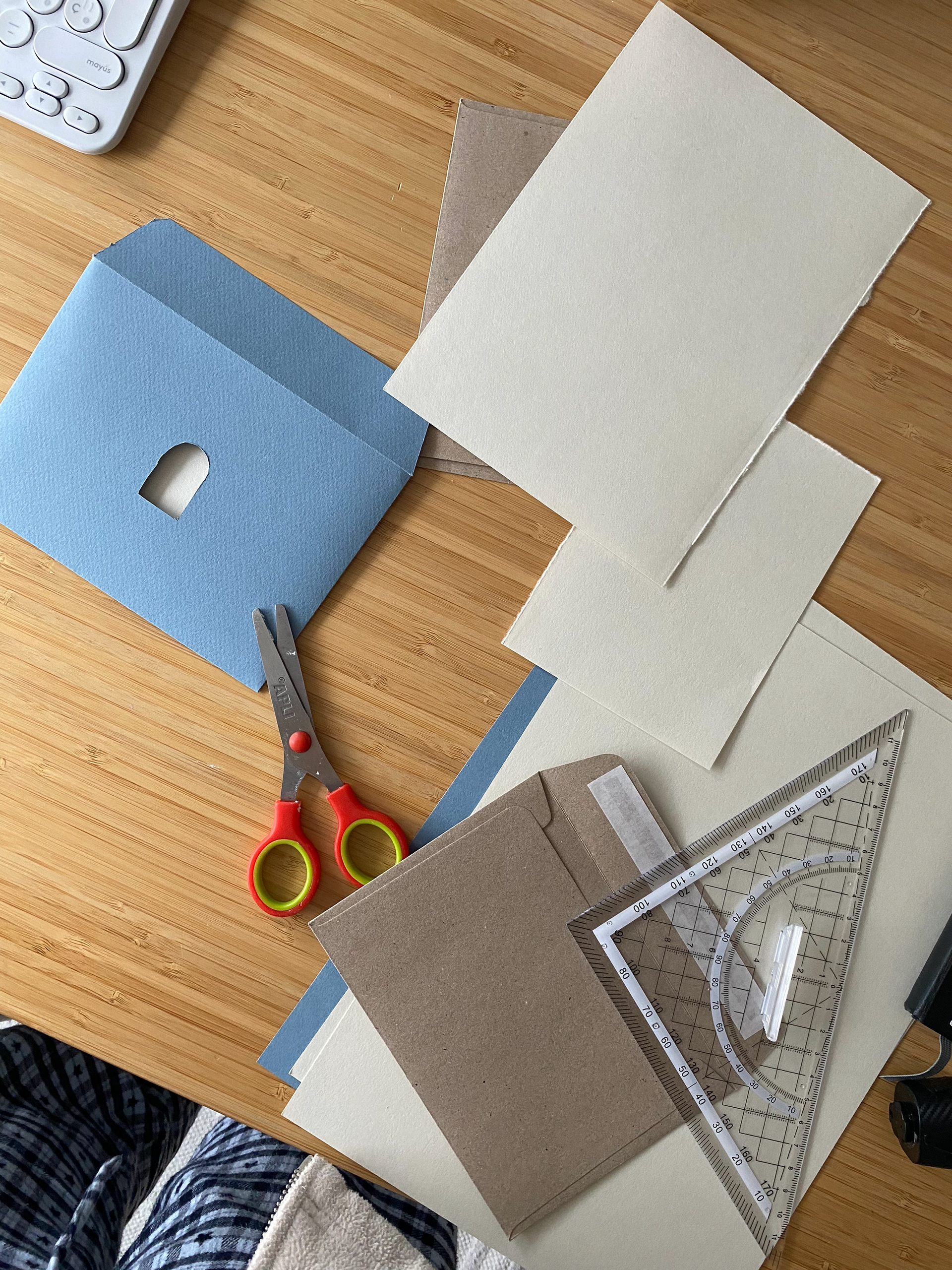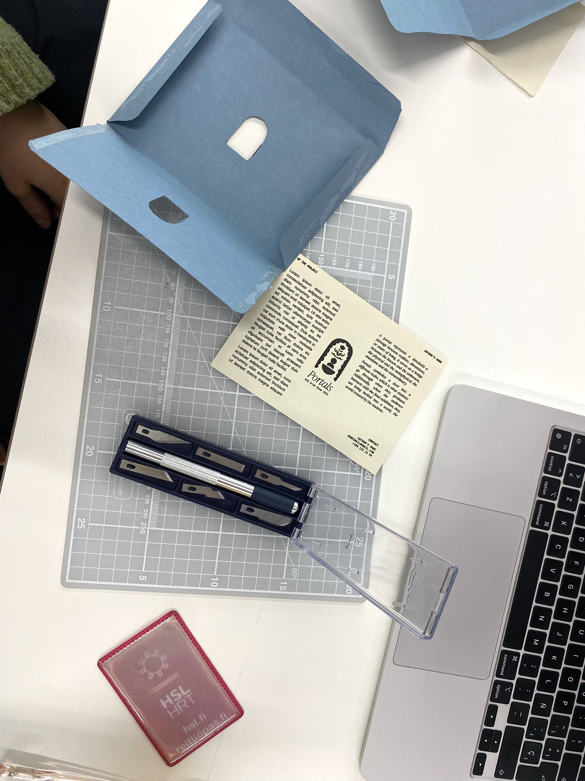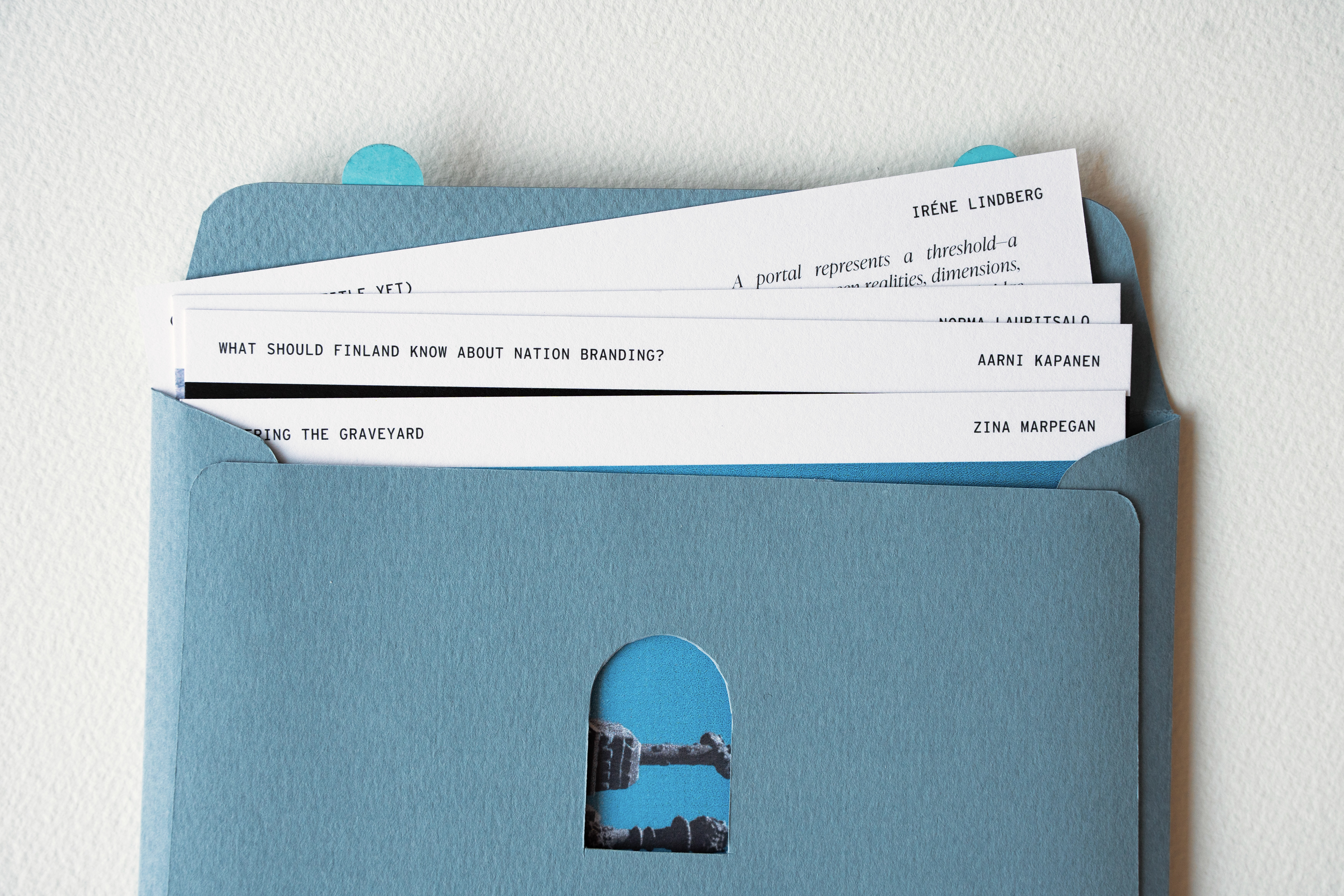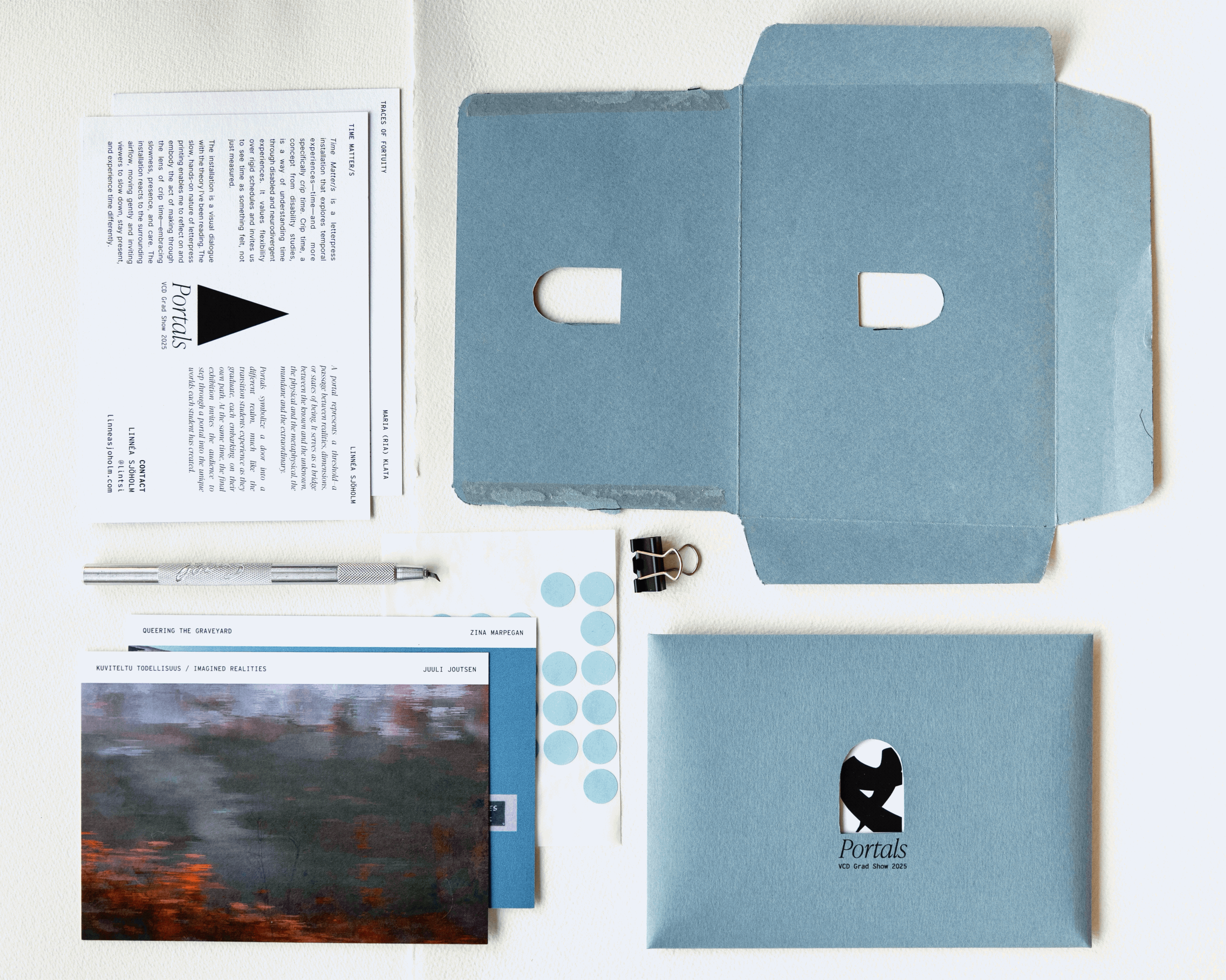 At the same time, we wanted a way to bring all the postcards together into a single object that could be given to participating students and teachers, something closer to an exhibition zine or catalogue. I designed an envelope featuring the exhibition logo and a cut-out window at its center. Through it, one side reveals a student-drawn portal, while the other shows an image of a project from the exhibition. Which portal and project appear is entirely random, depending on how the postcards are arranged inside.
